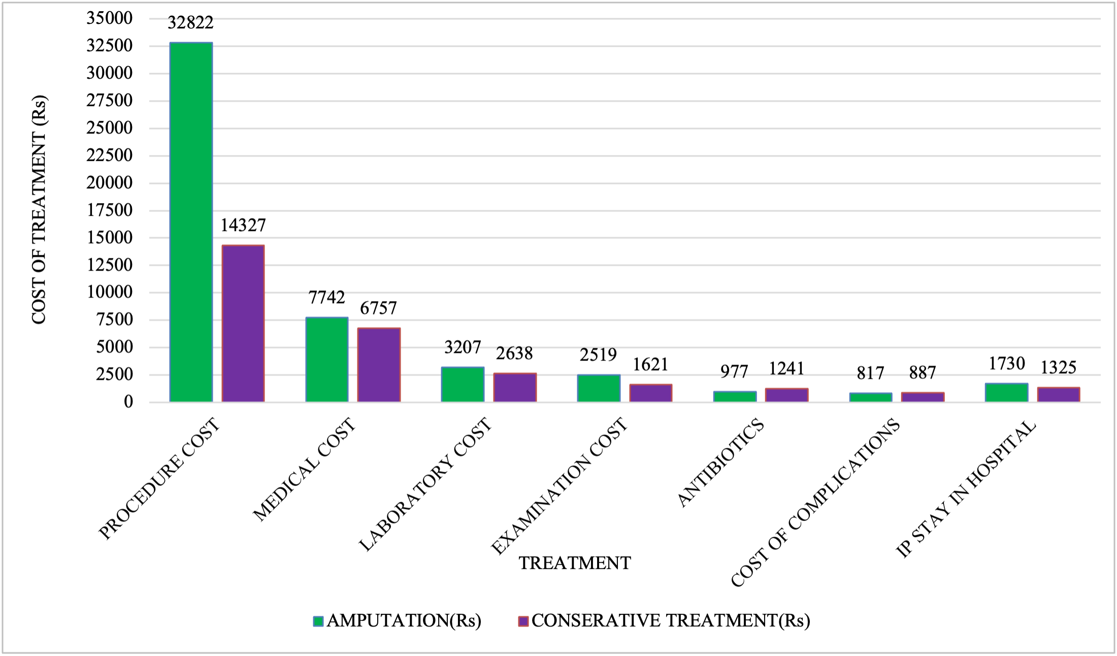 Conclusion: Study concludes that, economic burden on diabetic foot ulcer in conservative patients was slightly more while compared to amputated patients by descriptive statistics even the statistical analysis shown less significant difference. Because the necessity rate for extra hospitalization and medical services was more for conservative treatment (Debridement, Fasciotomy, Incision and Drainage) when compared to amputation patients with diabetic foot ulcer. whereas in the pharmaco-economics there was not much significant difference among both amputated and conservative patients.
