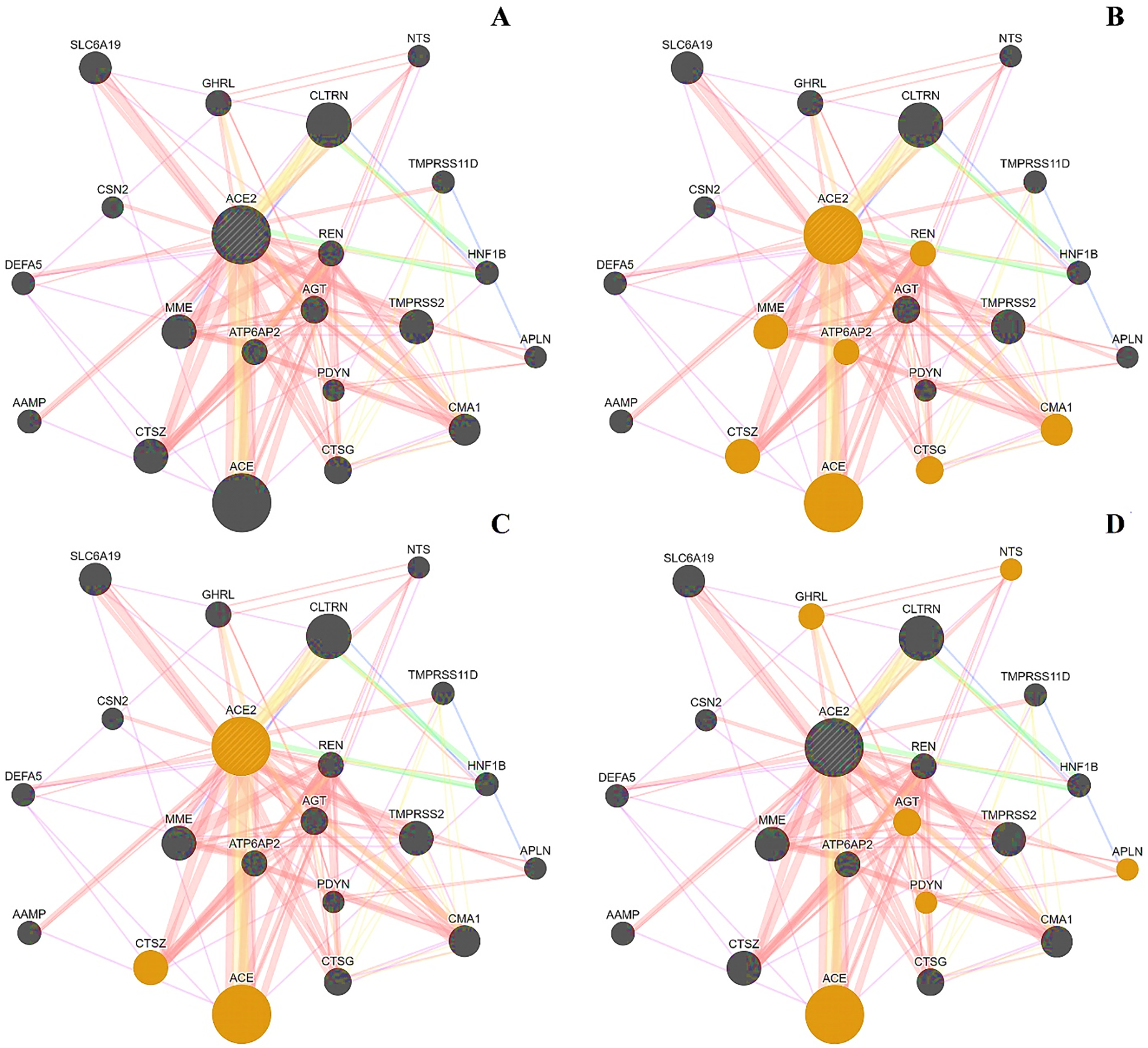 Fig. 1. Molecular string networks representing genes involved in coexpression (A), GPCRB activity (B), exopeptidase (C), and SRLP processing (D) required for S-protein influx mechanism.