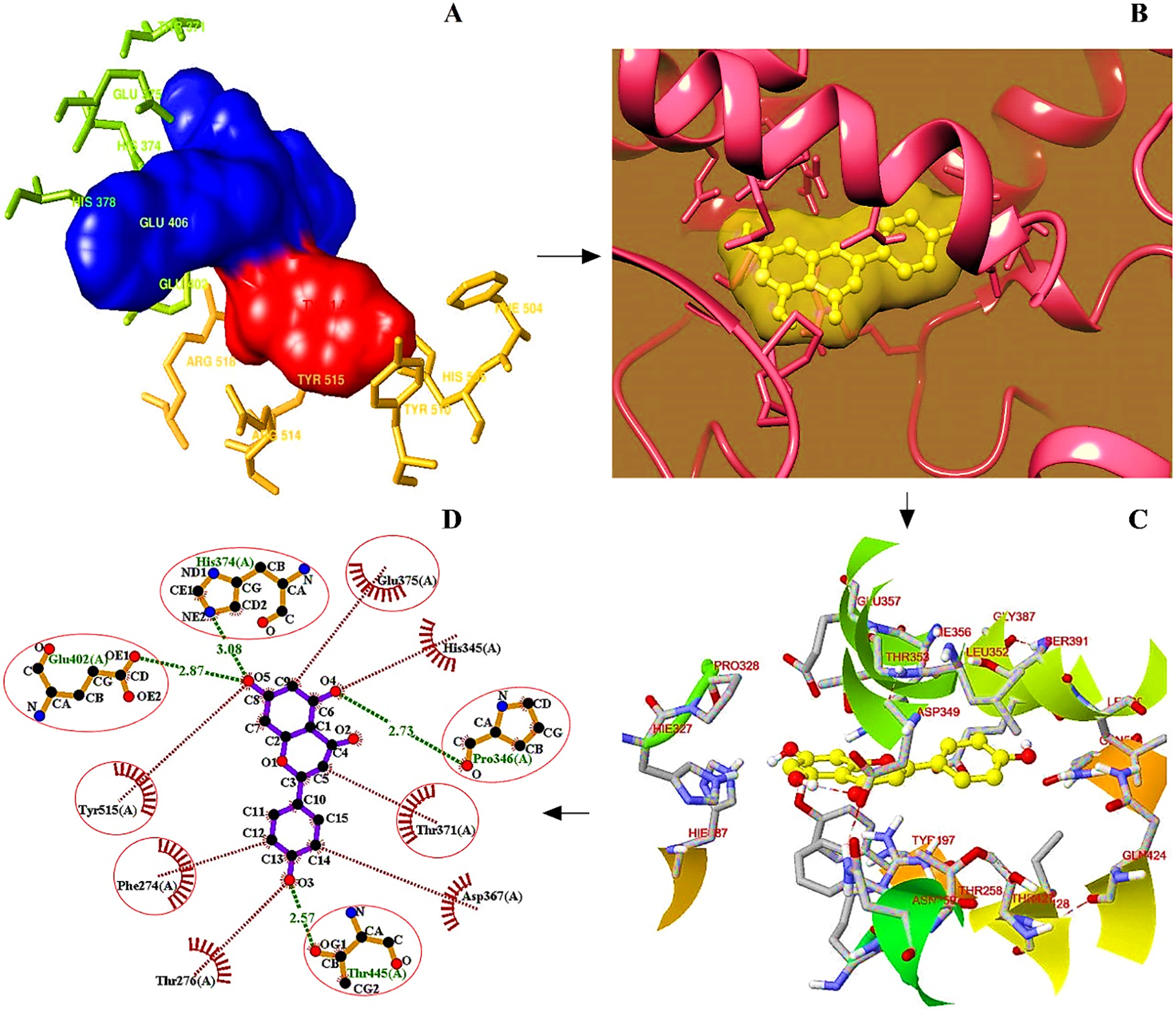 The predicted binding energy (confidence score of 1.00) for an effective ligand interaction was −6.9 kJ/mol (Fig. 2B). The molecular docking resulted from the predictive binding energy for the flavonoid-protein complex as −8.1 kcal/mol (Fig. 2C). This complex obtained after docking simulation was analyzed and identified hydrogen bonds and hydrophobic interactions. The amino acid residues engaged in hydrogen bonding (green lines) and hydrophobic interactions (red lines) are mentioned (Fig. 2D).