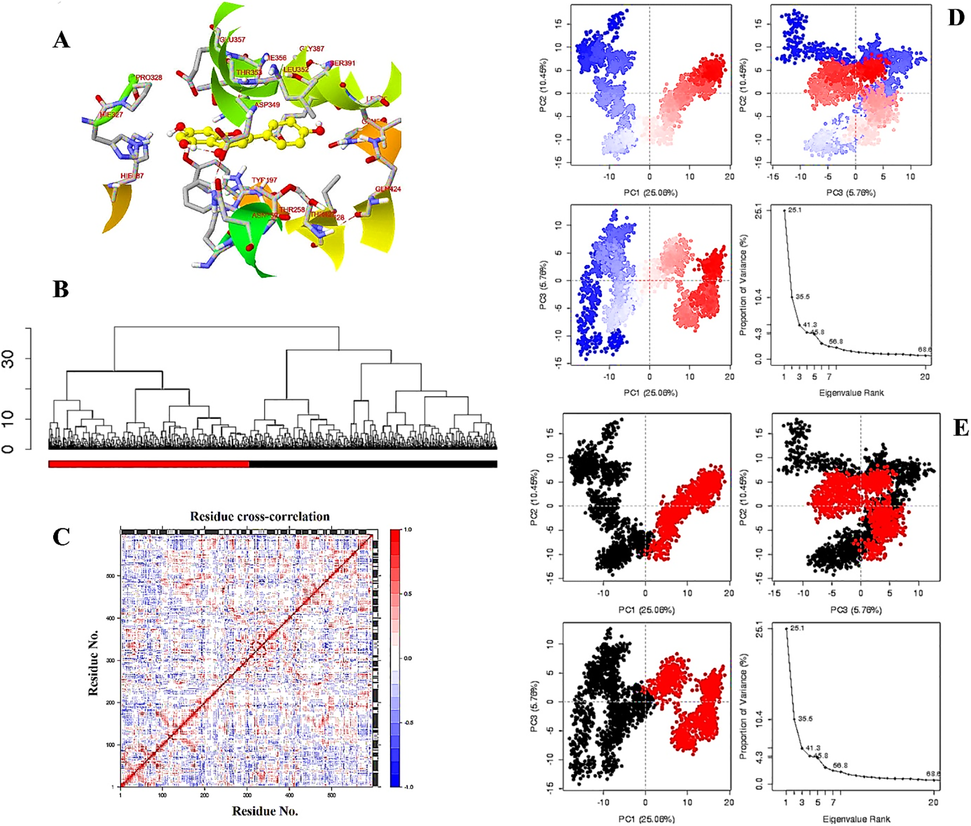 Fig. 3. Demonstration of the apigenin-ACE2 receptor complex profile at the 100 ns of MDS (A); a clustering dendrogram derived from principal component analysis (B); a heat map of the molecular dynamics residual cross-correlation matrix (C); PCA cluster analysis with trajectory frames from blue to red in order of time (D), which are recovered by changing conformations from black to red (E); PCA scree plot showing the proportion of variance against its eigenvalue rank, where the first three eigenvectors contribute over 40% of the total variance (D and E).