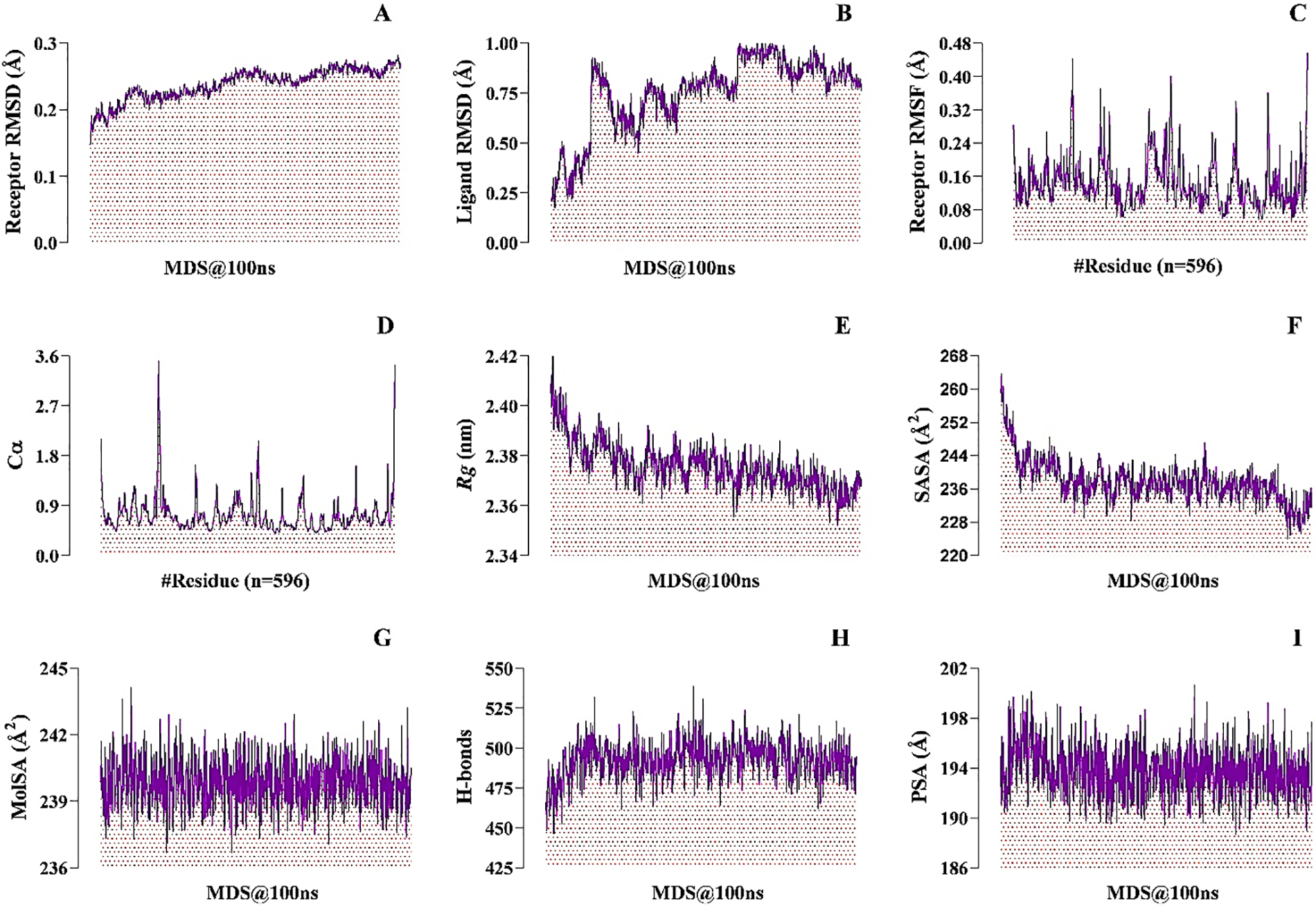 Fig. 4. Systematic profiling of the receptor RMSD (A); ligand RMSD (B); RMSF (C); Cα (D); Rg (E); SASA (F); MolSA (G); H-bonds (H); and PSA (I) values resulted from the MDS (100 ns).