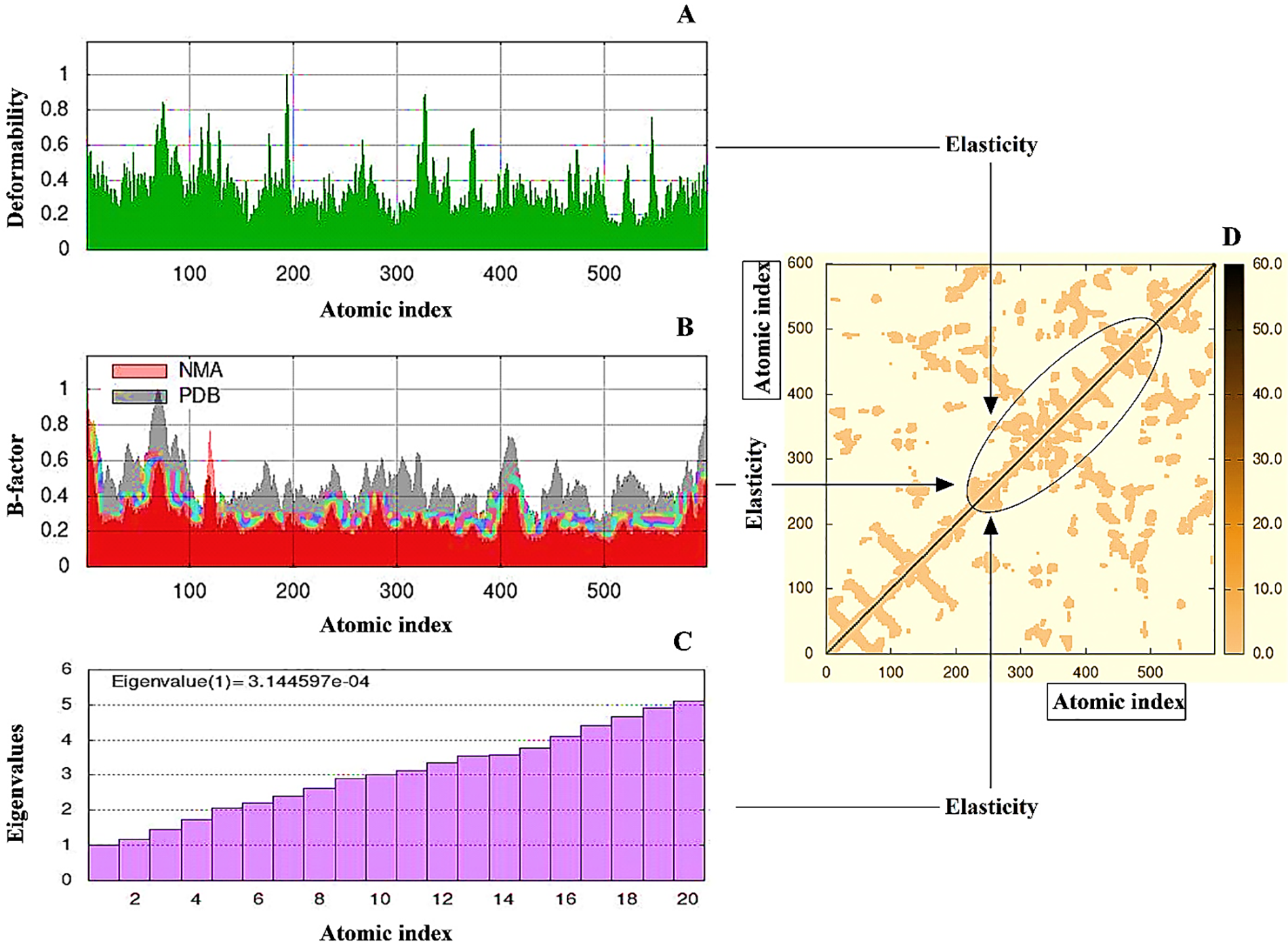 Fig. 5. Structural profiling of the deformability (A); B-factor (B); Eigenvalues (C); and molecular elasticity (D) based on the electrostatic reinforcements of MDS.